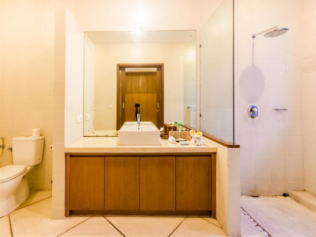There are four bedrooms within the villa; one attached to the main building, with king-sized bed and then the other three within separate guesthouses. The master guesthouse overlooks the swimming pool and has fine palimanan stone steps which lead from the garden. The bedroom is air conditioned and has a king-sized bed, wardrobe with safety deposit box and en-suite bathroom with open shower.