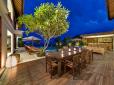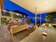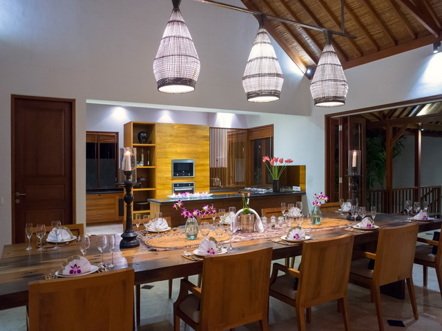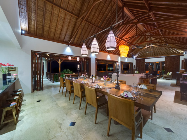The upstairs formal living and dining room is your first point of contact with Villa Asada, and is where the cold towels, tropical drinks and a warm Bali greeting awaits. Long comfortable couches, high ceilings, a heavy wooden dining table with seating for 12, and antique furnishings fill the space, yelling grandeur through every pore. Across the front wall, French doors fold back to show off the stunning views from the balcony, where a second, more informal dining table gives guests a chance to watch the twinkling lights of the coastline and ships riding at anchor by night, or to take in the twin blues of the sky and sea over a leisurely breakfast. The open-plan designer kitchen sits at the far end of the room and is split into two sections, front and back, each with ovens and prep areas, to allow for guests to cook if they choose while the staff remain discreetly out of sight.