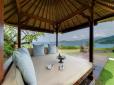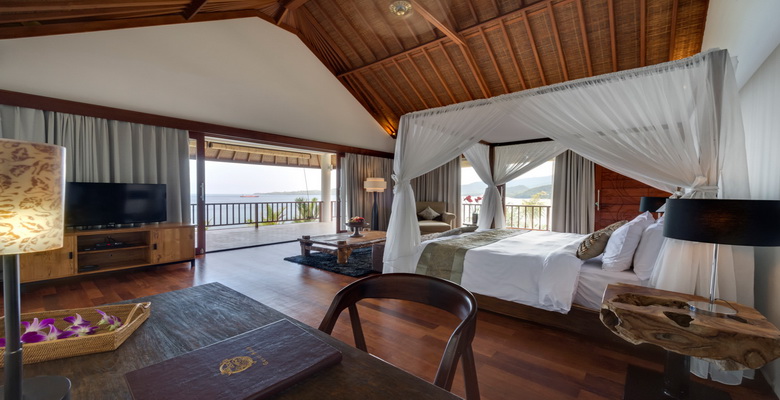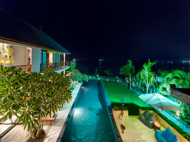 From its hilltop perch on the island’s remote eastern coast, the villa overlooks the calm blue waters and swaying coconut palms of Labuan Amuk Bay, where traditional fishing boats sail the trade winds by day and star-filled skies twinkle above the inky void at night.