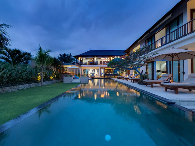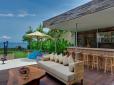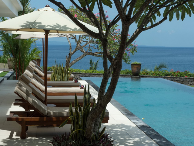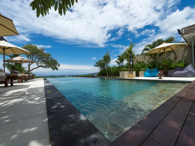 The garden is ‘swimming’ with places to relax in either an upright or horizontal position. Eight sunloungers line the pool’s deck and terrace, each with umbrellas, and with some sharing the shade of the yellow and pink frangipani trees that overhang the 18-metre infinity edge pool. A well-stocked bar, complete with swivel stools and martini shakers, sits next to a cushioned sitting area on the terrace, a table tennis table, and a long 10-seater wooden table providing the alfresco luncheon venue. A well manicured lawn lets you get the grass between your toes and finally, a cushioned Balinese gazebo sits at the very front of the property right upon the cliff’s edge.