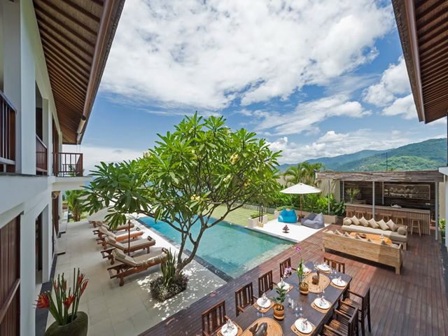 The villa comprises two double-storey pavilions built in an L-shape around an18 x 3-metre pool, both oriented to the south-east with uninterrupted views of Amuk Bay and the island of Nusa Penida. The main pavilion houses the formal living/dining room and kitchen area on the top floor and opens out onto a balcony. On the ground floor are two of the guest bedrooms, both flanking a large air-conditioned TV room and lounge. The second pavilion presents a master bedroom on each floor, while outside, beside the pool, is a bar complete with an alfresco lounge and dining space on the