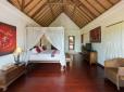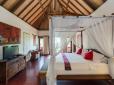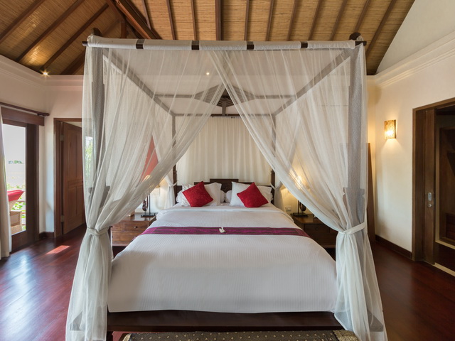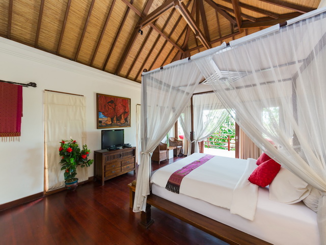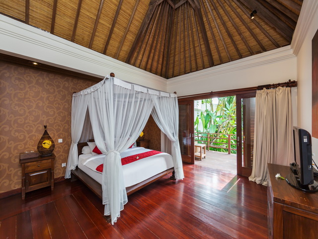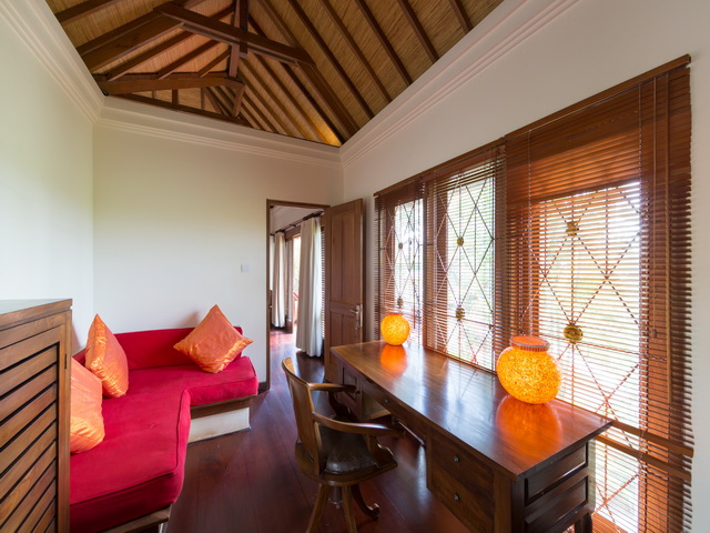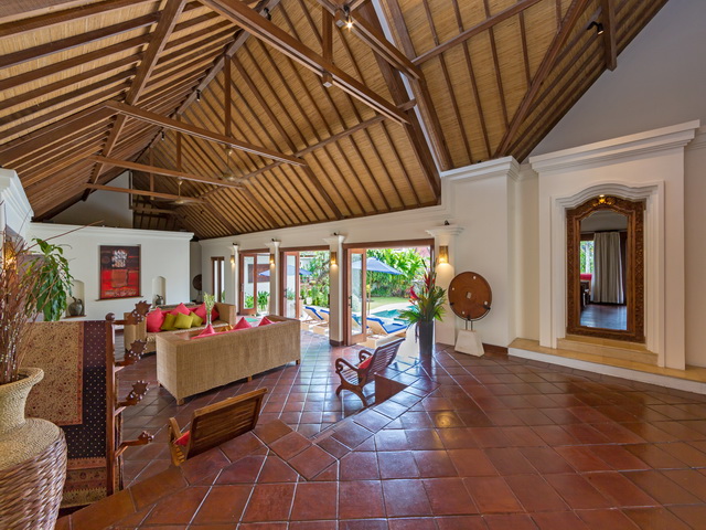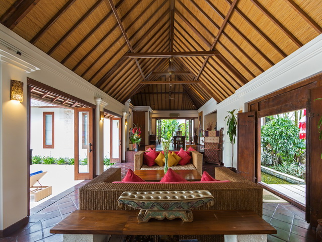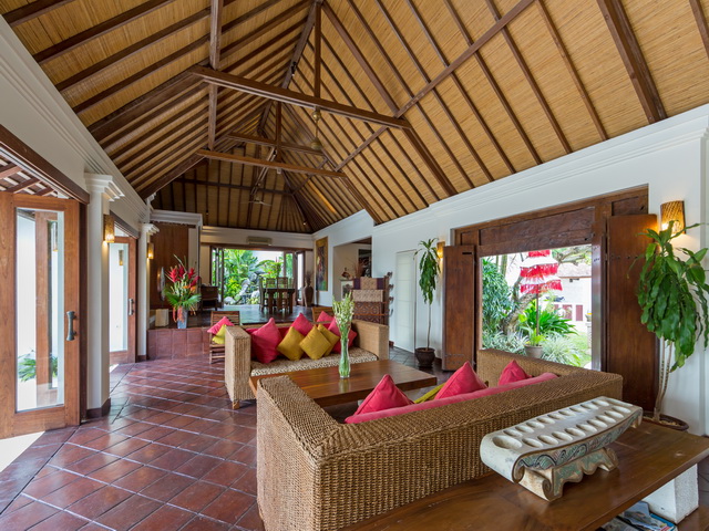 This large 4 bedroom villa situated on a 4 are on the edge of rice terraces has been designed so that guests can enjoy the unsurpassed views from almost the entire villa. The stunning 18 x 7 meter split level living / dining area has been designed for relaxation and entertainment and provides optimum enjoyment of the unsurpassed Rice paddy and unforgettable Sunset views. This area with its high Wooden / Sirap roof, the cool terracotta floor tiles and natural cream walls is the very essence of tropical living. Overhead, gun-metal coated Ceiling fans and the gentle breeze blowing in from the rice paddy ensure everyone is kept cool. Ample seating is provided in the lounge area so everyone can relax in and listen to the excellent surround sound speakers discretely hidden in the ceiling.