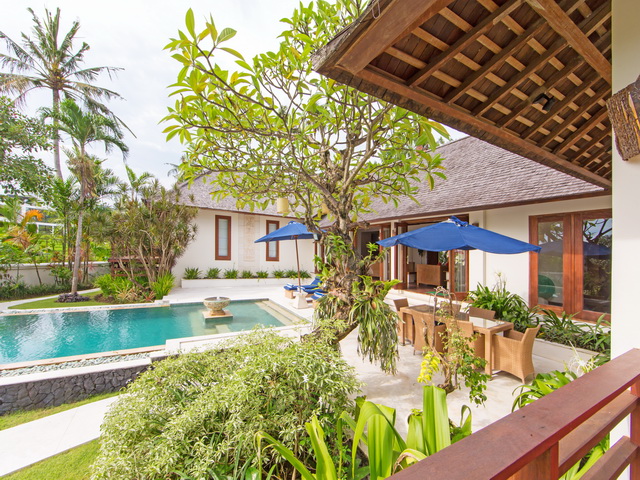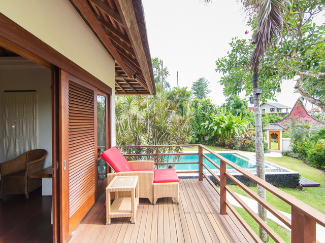 The dinning area houses a solid wood Dining table that comfortably seats 8 with adjoining bar to enjoy that pre dinner cocktail. The villa has been designed with traditional Balinese building materials with high vaulted Wooden / Sirap roof, “BenKiri” Wooden floors and Balconies, Teraso and walls adorned with colorful local Balinese artwork creates a refreshing Tropical environment but offers the discerning traveler 5 Star accommodation and service.