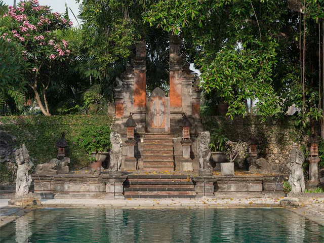 The lower gallery of the Lembu Balé houses the current Australian owner’s astonishing collection of Balinese art – including the Donald Friend painting he bought from the artist himself on first visiting Villa Batujimbar in 1972. This private collection rivals the island’s finest galleries and museums and is a unique feature of the villa. Guests are welcome to view the collection on special request. Yet art is not confined to this space alone throughout the living and sleeping pavilions you’ll come across architectural treasures, rare artefacts, painted antique doors and windows, and heirloom paintings that reveal the owner’s passion for Balinese art and craftsmanship. And within the expansive gardens are myriad moss-encrusted statuary and intricately carved stone reliefs. Bali’s beauty shines in the materials used too – vaulted alang-alang thatched roofs, lava stone steps, coral walls, and terrazzo and teakwood floors.