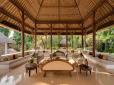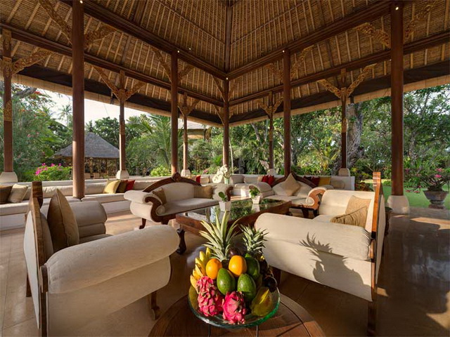 Open-sided living pavilion; Lembu Balé lounge; poolside veranda; garden dining bale with table for 10; beachfront balé; study and sitting room below master bedroom.