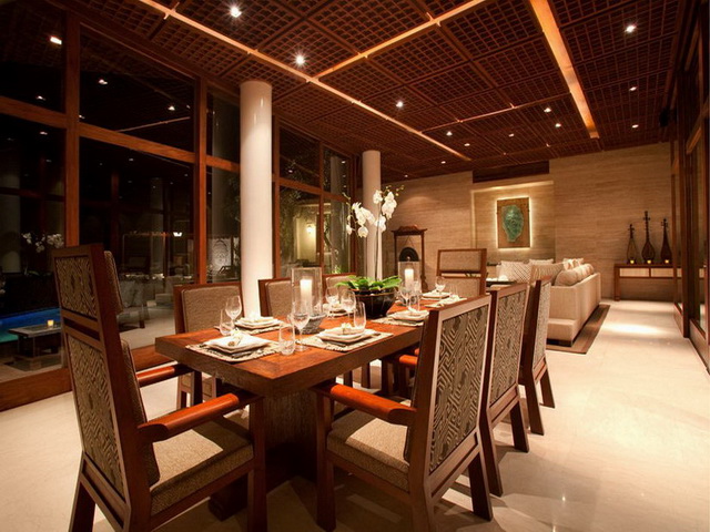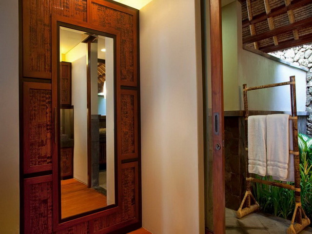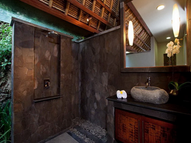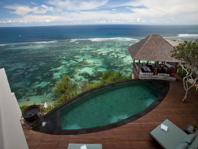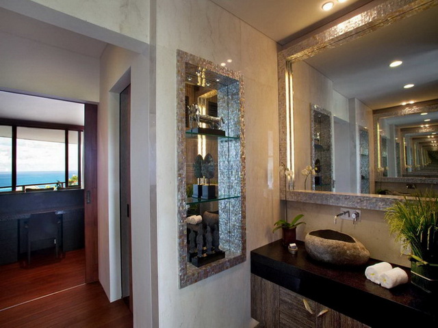 The Bale, which serves as an outdoor dining and contemplative venue of this luxury Bali villa, overhangs the cliffs and sits next to the 18 metre infinity pool. The view from the ironwood deck appears as though you are at the oceans edge. The upstairs master suites are decorated with wonderful local modern furnishings, each with outdoor Japanese soaking tubs to complete the feeling of pampered luxury.