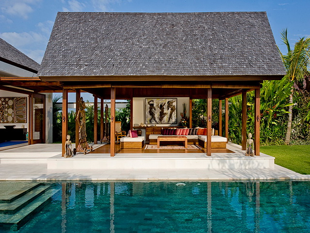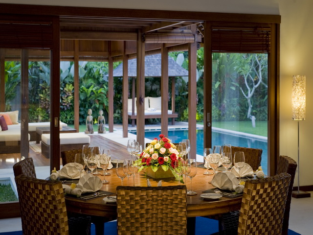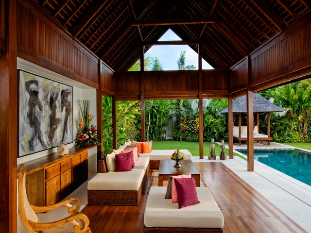 Villa Bima’s living area overlooks a flourishing tropical garden offering guests a true taste of tropical Bali living. Unwind poolside on the loungers or relax on the deeply cushioned sofa, which can comfortably seat ten guests, below the pavilion’s soaring traditionally crafted roof. Living areas are fitted with iPod speakers, and an iPod loaded with music to suit all tastes is available on request, making this the ideal spot to catch up with friends, read a book or enjoy cocktails and canapés at sunset.