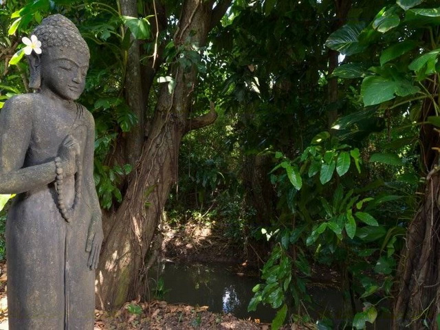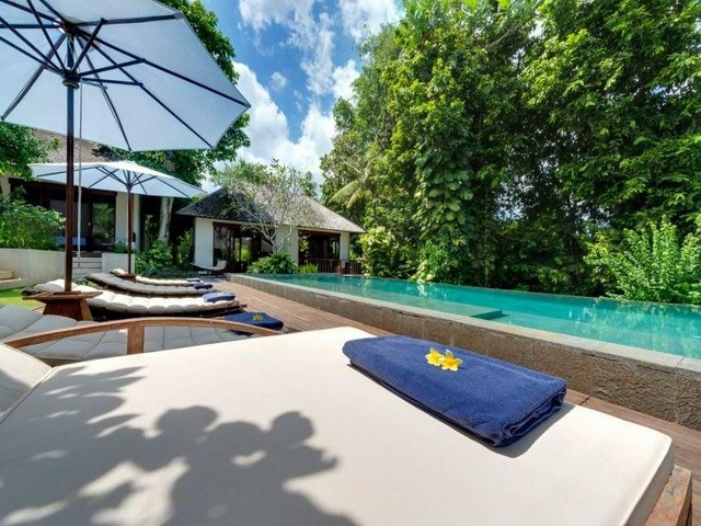 The architect designed Villa comprises 5 separate pavilions with feature ceilings including 4 double bedrooms, a multi-media room, a separate modern kitchen, and a magnificent open air main pavilion. The infinity pool is fronted by hardwood decking with sunbeds. It is designed with multiple depths so children of all ages can enjoy it. The lower plunge pool fronts the river where you sometimes see fish or swimming lizards.