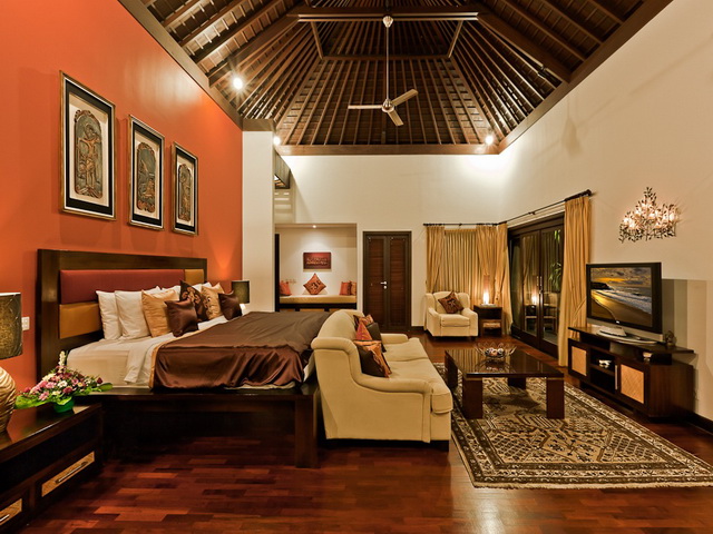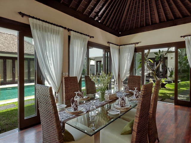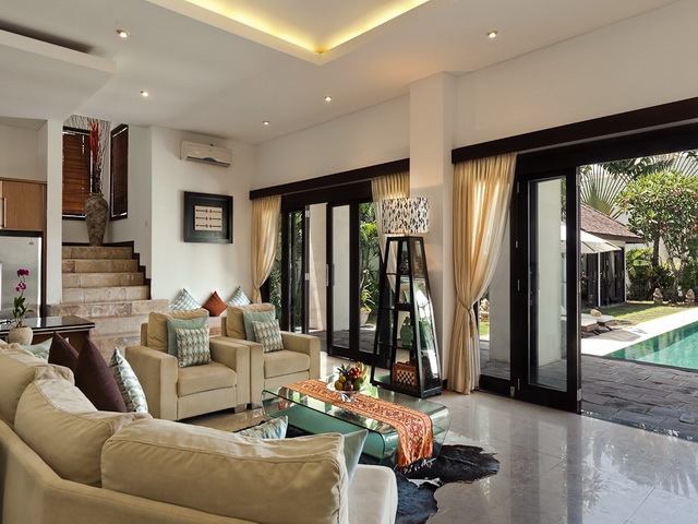 Villa Cantik has a large central living pavilion with marble floors, three soft and comfortable couches, a 37" flat screen TV with satellite channels, DVD player, and a fully-equipped European-style kitchen, in addition to a staff wet kitchen where the staff prepare guest meals. Stairs lead up to the upstairs master suite, while to the right is the second bedroom. French doors run the entire length of the downstairs area and open out to a wide stone terrace and garden. A 20 x 6m pool dominates the outdoor area and is flanked on opposite sides by the third bedroom and an outdoor formal dining room with seating for eight persons. All the rooms have A/C and both the living and dining rooms can be closed off for air-conditioned comfort.