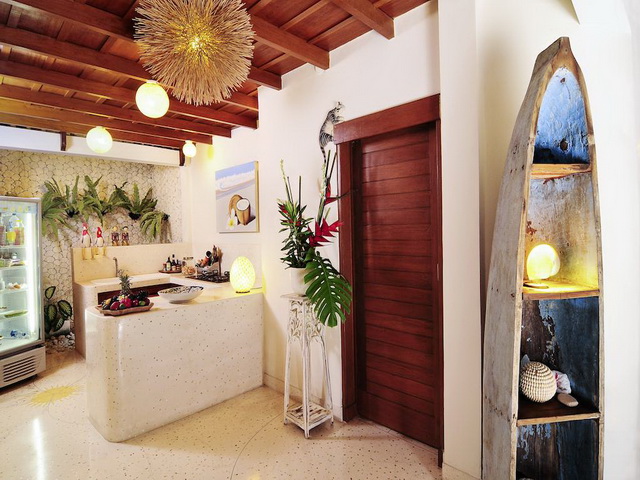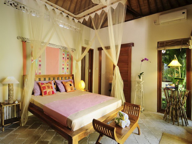 The rooms all have similar facilities but one room is situated in a private bungalow nestled in the corner of the garden. This charming suite features glass doors sliding open to the garden providing guests with a lovely view to wake up to in the morning. Inside the air-conditioned room wears soft colors of old style pink,yellow and green and it features a canopied queen-size bed. There is a little fridge for some late night thirst, a table and chair with reading lamp, a wardrobe closet with safety deposit and the bright en-suite bathroom is partly open featuring a tropical shower surrounded by natural stones and green plants.