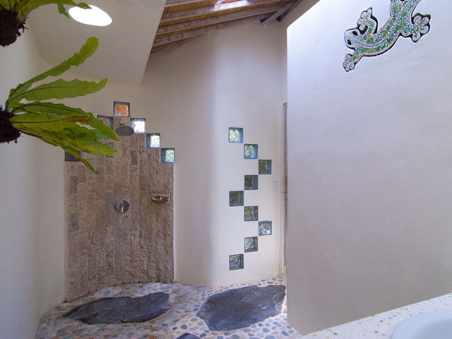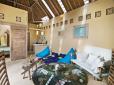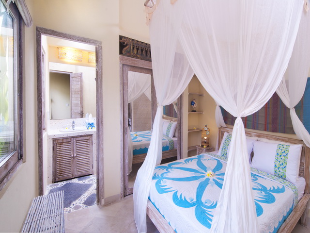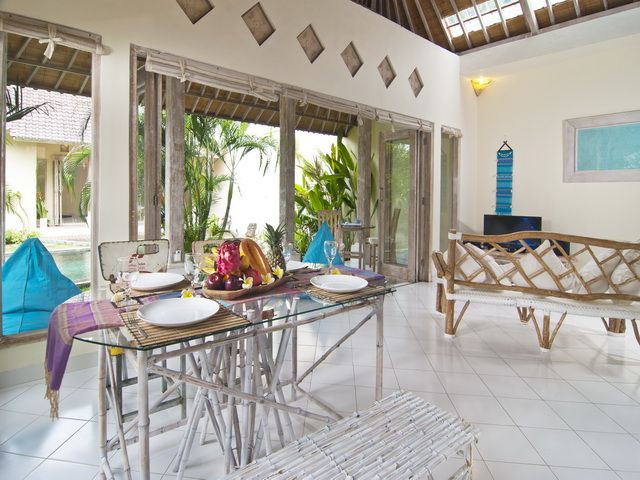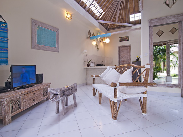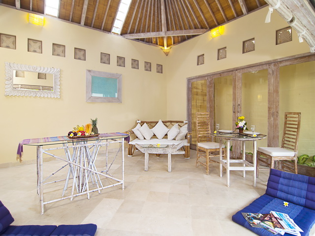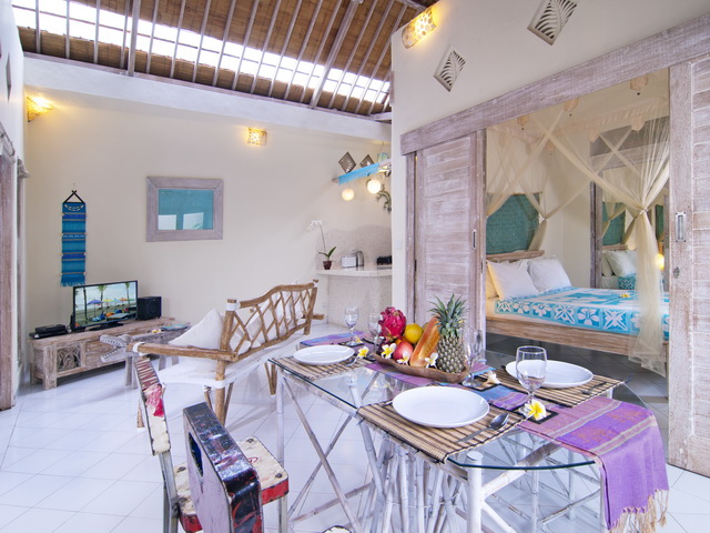 Each of the two self-contained bungalows, flanking the sides of the garden, feature a living room with a serene ambiance and an open-plan kitchen. One of the living rooms is slightly bigger than the other, featuring the main dining table and a flat-screen TV with DVD-player for entertainment whilst the other one is equipped with beautiful Thai mattresses for meditation and there is also enough space for practising yoga in the morning. The bungalows are designed with high Balinese rooftops, beautiful whitewashed wooden interiors and decorated with tasteful artwork and gorgeous framed mirrors,. The spaces bath in natural light as there are windows in the roof and there are full length glass doors sliding open to a veranda overlooking the pool. Both the rooms feature comfy lounge corners and seating areas.