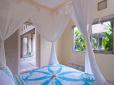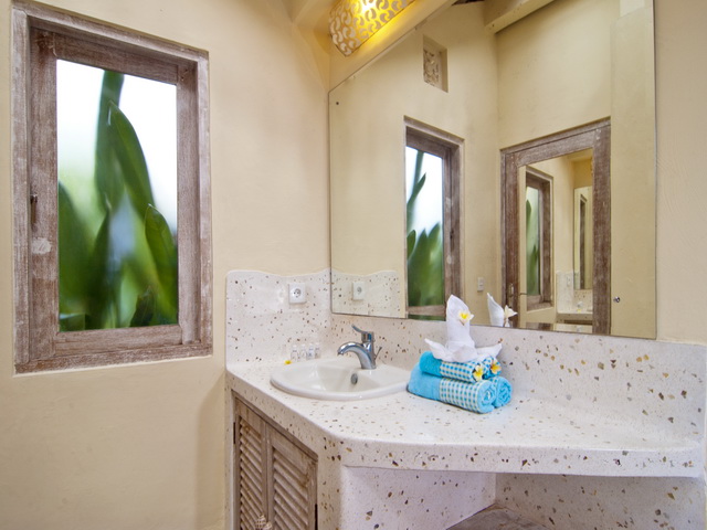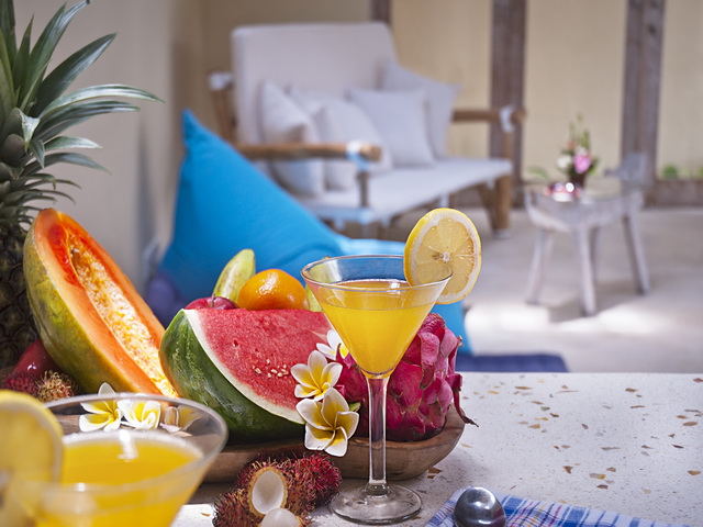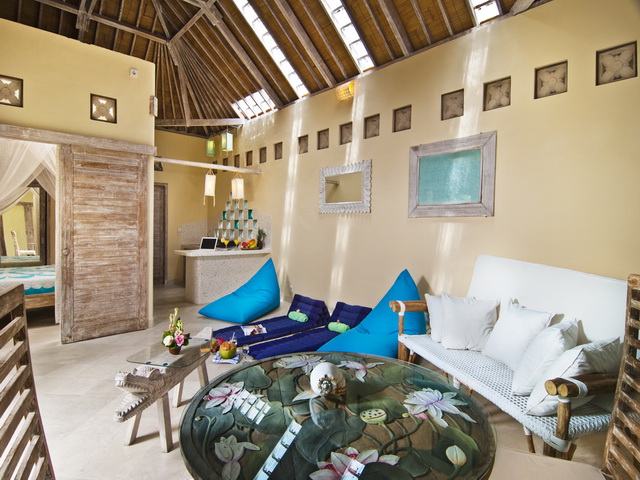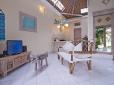 Both bungalows are adjoined by a villa suite featuring a romantic king-size bed draped by white curtains and enriched by chic throws and pillows. The rooms are fitted with large built-in wardrobes where you can stash you valuables in a safe box and the bright terrazzo en-suites boast rain-shower on a timber deck.