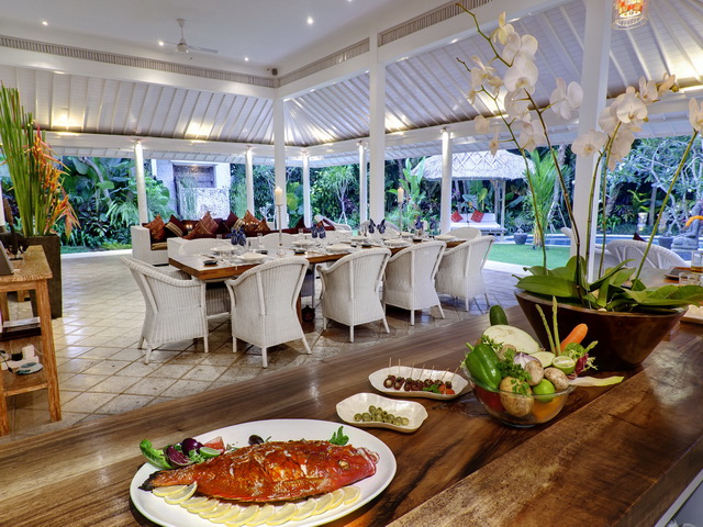 Large white palimanan (local stone) paving stones lead to an expansive 120 m2 open-air living and dining pavilion, which opens out onto the lawn and main pool. Large overhead fans suspended from high timber-framed white ceilings keep the area cool and open terraces will enable you to enjoy ultimate tropical living. Two large 5-seater rattan sofas face a large wide screen TV and two additional Raffles style rattan sofas look towards the garden and pools. A large, beautifully crafted timber dining table seats up to 14 people.