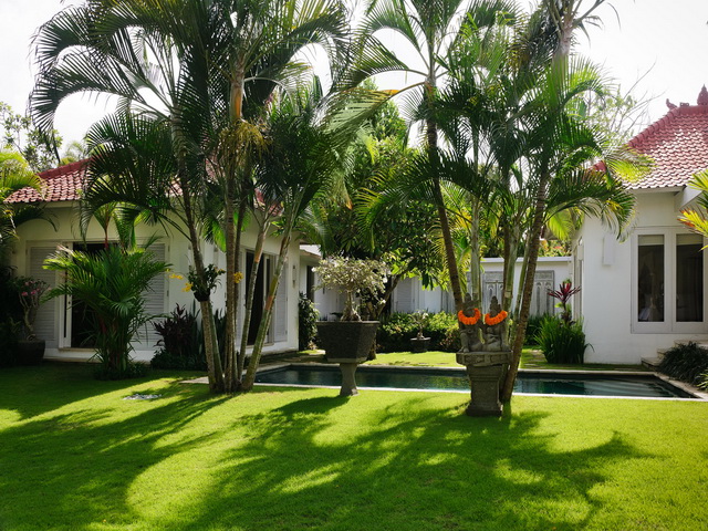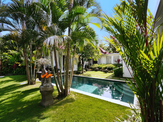 The property is accessible via a private driveway, which is manned by security personal. Enter through traditional Balinese double wooden doors onto a beautifully manicured lawn. A koi carp fishpond, water feature and several rare and very large Hawaiian palm trees are placed within a garden full of tropical flowers and fauna. The larger of the pools sits directly opposite the main living area. The second, smaller pool separates the living pavilion from the master bedroom. Ten sun bathing chairs and a soft cushioned Balinese bale (Gazebo) will help you to relax the senses.