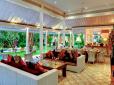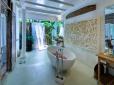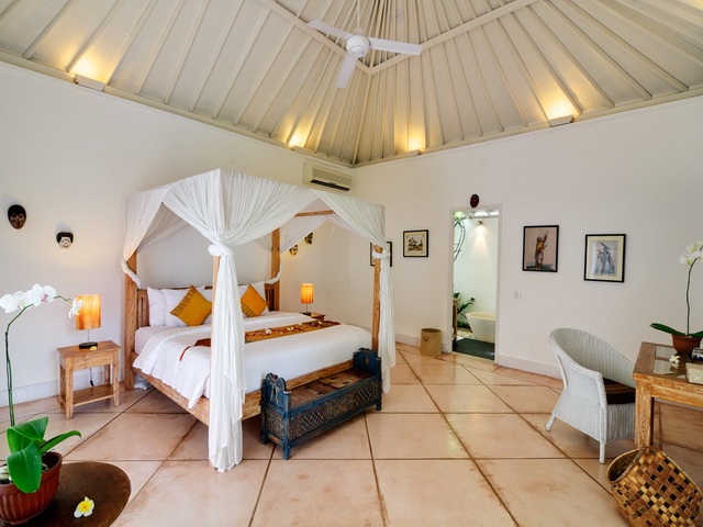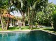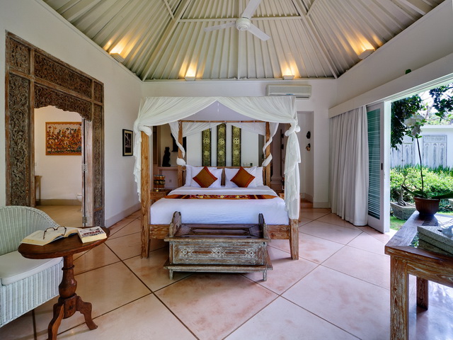 A white palimanan terrace leads you from the main pavilion through to an L shaped courtyard. Two bedroom pavilions are separated by a feature of three antique Bali doors that are beautifully lit at night. There are 4 bedrooms downstairs and one upstairs. All bedrooms downstairs have double doors which open out onto a courtyard and the garden beyond. Each bedroom has been tastefully decorated with individual colour themes and soft rose-tinted terracotta timber flooring. Cool white walls and white rattan easy chairs continue the Raffles theme throughout.