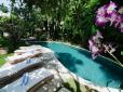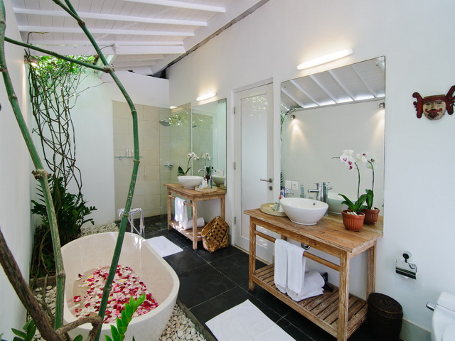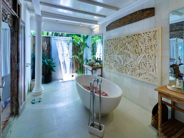 The main bedroom has an adjoining large cream terrazzo bathroom accessed via two antique timber doors. The bathroom has a bathtub situated in the centre of the room, which is large enough for two people. A separate outdoor shower is located behind a glazed wall and bamboo feature. The twin bedroom has an outdoor shower and a delightful courtyard.
