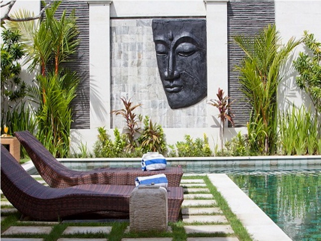 As you walk in you can see a strikingly beautiful Asian mural carved out of stone, and to your right is a large L-shaped private pool with salt water, perfect for morning swims and children to play. There is also a shallow splash area, which is ideal for babies and infants. Comfortable sun loungers are provided for those wishing to catch a golden tan during your stay.
