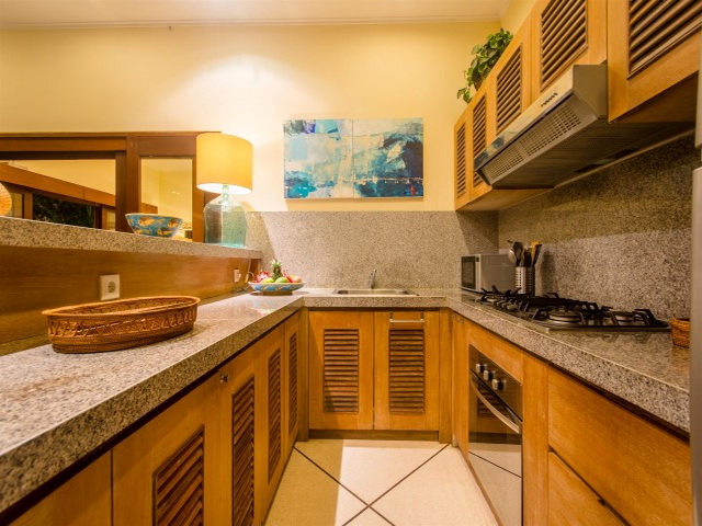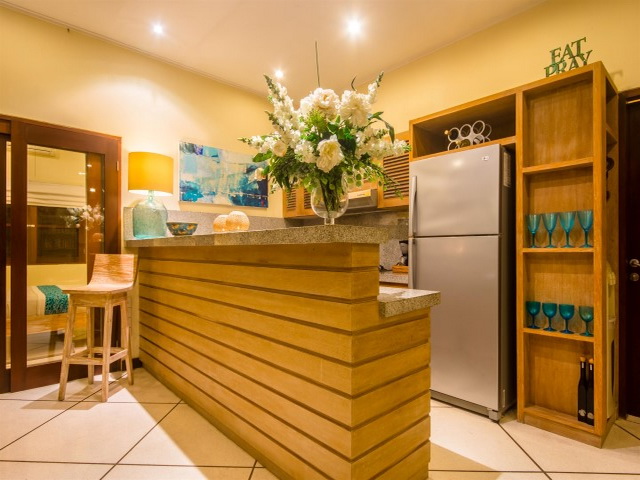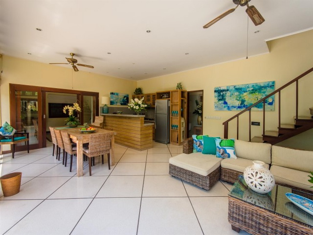 Opposite the dining and living area is an air-conditioned bedroom, which has king-sized bed, a ceiling fan, a safety deposit box in the wardrobe and a large ensuite with an outdoor shower and wash basin.