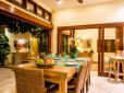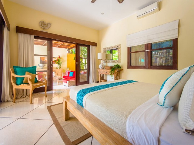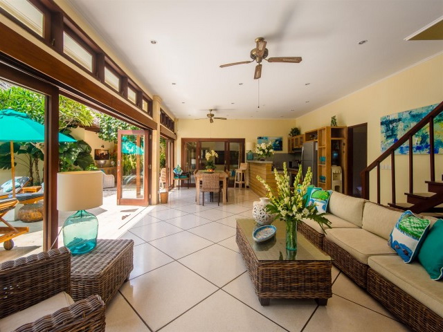 This spacious two-storey villa has four bedrooms, one TV room that can convert to a bedroom, a private pool, and a garden adorned with loungers and a large Bali gazebo. Doors and windows fold away giving the buildings an uncluttered feel.