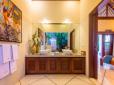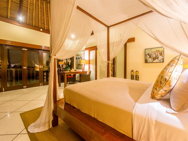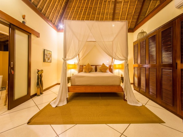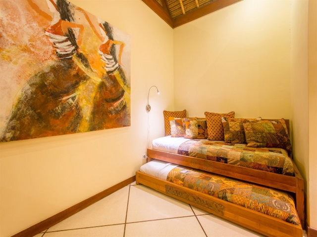 Upstairs, the air-conditioned master bedroom has a king-sized bed, a ceiling fan, a safety deposit box in the wardrobe and a large ensuite with shower, bathtub, and twin washbasins. Adjoining the master bedroom is a TV room which has an LCD TV with access to international channels, a DVD/CD player and speaker system. This room can also be converted into a fifth bedroom with two single beds ideal for a family with young children or teenagers. Both rooms over look the garden, pool and rice fields.