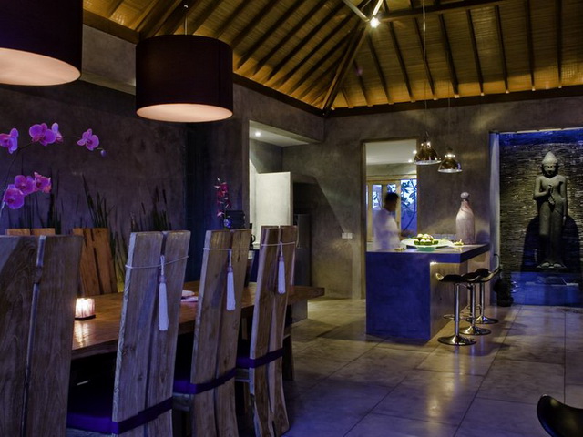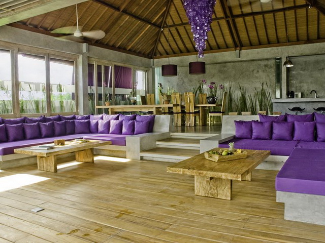 5 en suite bedrooms on 2 levels designed in shades of purple and white accents. 3 bedrooms are located on the ground level and 2 on the second. Bedrooms are spacious and well lit with natural light filtering from large floor to ceiling glass windows. Large open air showers, sunken bath tubs with several counter spaces are to be found in the bathrooms. Spacious outdoor living area is available in one of the upper bedrooms. Relax in the pool and the outdoor lounge area or the semi open air living quarters with the sound of a cascading waterfall. A fully equipped kitchen and built in bar is available for your enjoyment.