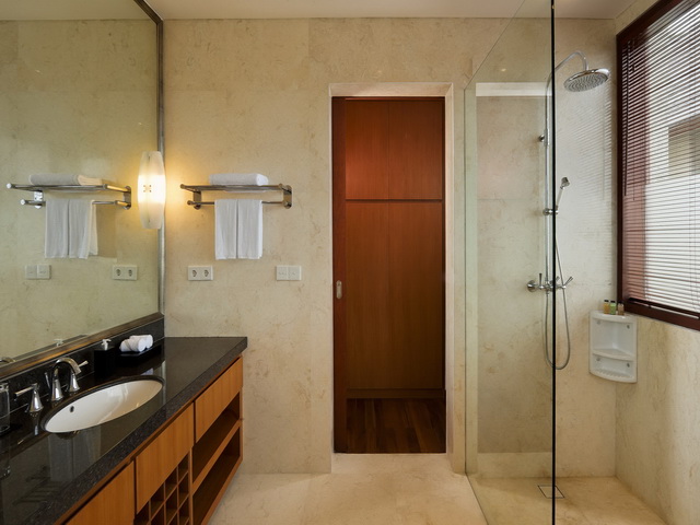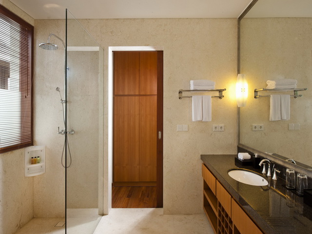 There are four bedroom suites with polished teak floors and cabinetry in the two-storey sleeping pavilion. Three are furnished with king size beds and one with twin beds (which can be put together with a specially designed top mattress). Each has an ensuite bathroom, as well as a spacious dressing area with plenty of hanging space. Each bedroom is equipped with a 42” satellite-channel flat screen TV plus a DVD player (upon request), air-conditioning, ceiling fan, safe deposit box and WiFi internet connection. The bedroom walls are adorned with beautiful original paintings by famous Indonesian artists as detailed under the heading “The Art & Artists”.