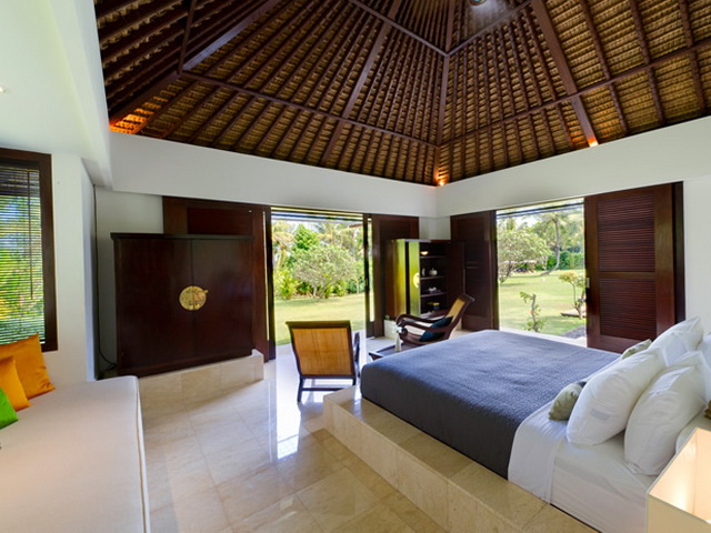 The huge garden rolls down to a dazzling 14-metre infinity-edged swimming pool bordered by a chequer board stone and grass terrace with a relaxation balé and a yoga deck to one side. The icing on the cake is the spectacular view of the ocean and the near-deserted, glistening, black-sand beach, a mere three-minute walk from the villa gates.