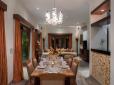 The dining room, which directly overlooks the garden and pool, can also be opened to give a sense of indoor/outdoor living or closed for comfortable, temperature-controlled dining.