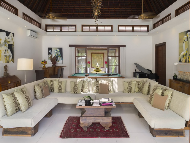 Living areas :Air-conditioned living room; open-sided dining pavilion with table for 16; media room; poolside balé; joglo entertainment pavilion.