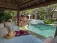 There’s plenty of outdoor living space at LataLiana I too: a traditional Indonesian grass-roofed pondok (rice shelter) serves as a poolside balé, providing a shaded alternative to the pool deck or the submerged seating at both ends of the pool. Parasol-shaded sun loungers dot the ironwood deck, while swing seats and clusters of casual seating on shaded terraces create further options for relaxation.