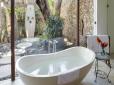Positioned for complete privacy, the master bedroom suite features opulent furniture set on a burnished teakwood floor. The imposing king-size bed, together with a selection of comfortable seating areas, is oriented towards a private walled garden surrounding a towering tropical tree. There’s another garden off the huge ensuite bathroom – a glamorous space with dressing area, upholstered seats, screened bathtub and both indoor and outdoor showers.