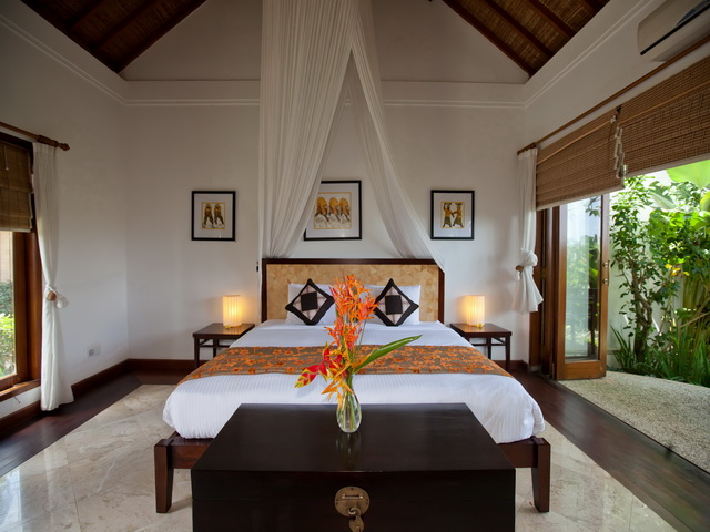 Five thoughtfully designed separate bedroom pavilions are beautifully positioned to capture the Balinese light and breeze while one bedroom is set higher on a second floor with breath-taking views across the rice paddies. Spacious deluxe rooms each have a Queen Size bed with a separate stone sunken bath tub and separate outdoor shower.