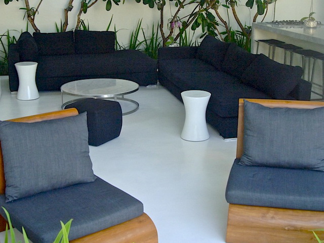 An outdoor sitting area looks onto the contemporary wall fountain, visible from the master bedrooms.