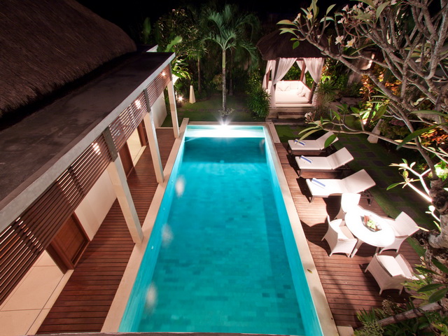 The integrated living environment is open to the elements and is orientated towards the pool. It is dominated by an oversized modular sofa that can seat up to six adults in absolute comfort. There is also a large screen plasma television with satellite channels and home entertainment system for relaxed viewing. Villa Sam houses an eclectic collection of artistry that extends to rustic artefacts, black and white photos of yesteryear Bali and other eye-catching pieces. There are also vibrantly coloured paintings, warm textiles and trendy home wares that are combined to create a look that can be described as tropical chic.