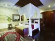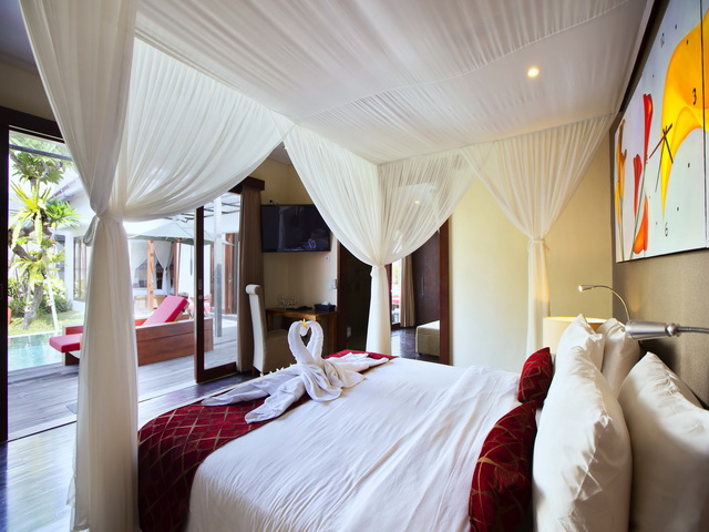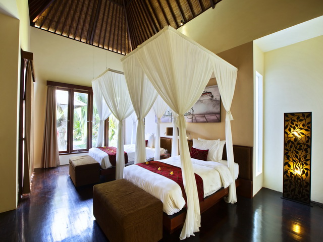 Villa Sam seminyak offers four bedrooms, generously spread across two pavilions and each uniquely designed to offer space, comfort and privacy. All rooms are fully air conditioned and beautifully decorated with wall paintings and artefacts. The living and dining area is extensively spread in a separate pavilion with sliding doors overlooking the pool area. The living area features comfortable seating loungers with bright coloured cushions. A flat screen TV and DVD players is placed facing the seating area for in-house entertainment. A fully equipped kitchen with easy-to-use cooking appliances is available for guest use. A polished wooden table with long chairs sits beside the dining area. Villa Sam’s design has a great focus on the outdoor features of the villa. It offers a serene tropical ambience with gardens, a private pool and a soothing gazebo to relax amidst the natural radiance of the villa. The pool deck has colourfulbean bags and sun loungers to relax and soak up the sun.