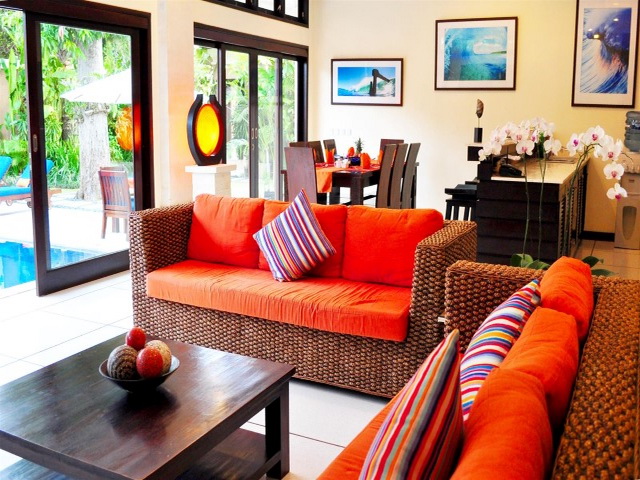 The grounds of the villa are dominated by a bright blue swimming pool, which is surrounded by a tropical garden filled with flowers and including a water feature which provides the peaceful sound of water to lull you to sleep. Beside the garden and close to the main house is a gazebo with a daybed, pillows, fan and music just perfect for reading, sleeping a massage or a game. The grounds also include a BBQ area, three sofa lounges and umbrellas and a large lawn all of which will make your holiday unforgettable and filled with wonderful memories.