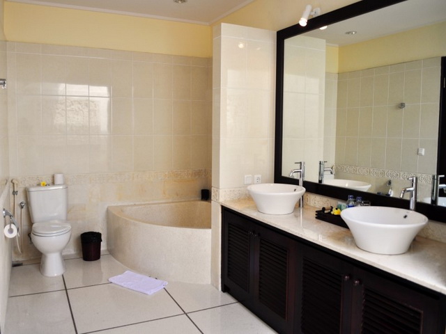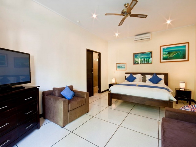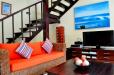 The master bedroom is located on the upper level and it includes a king sized bed, air conditioning, safety deposit box, a walk in dressing area, bath tub with beautiful natural outdoor shower, large flat screen TV and DVD player. The Master bedroom opens out onto a large balcony with daybed just right for an afternoon sleep!