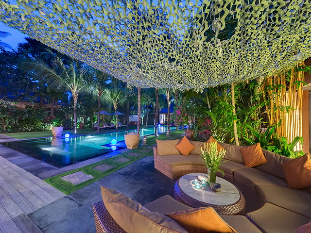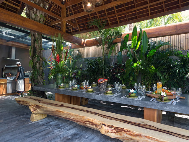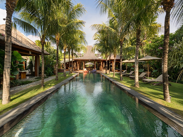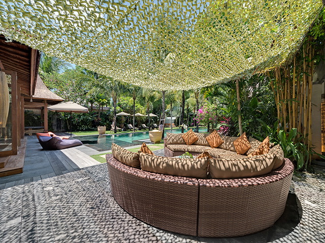 • Living areas : Living room; indoor dining for 10; outdoor dining for 20; 2 TV rooms; outdoor lounge area; poolside balé.