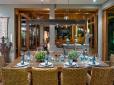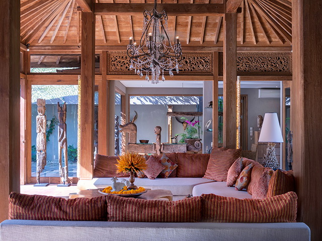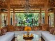 This single-storey villa comprises a main pavilion and a three-bedroomed guesthouse, set at opposite ends of a luxurious 19-metre swimming pool. The open-plan design of the main building allows natural light to flood into the space and accentuates the honey-coloured detail of the recycled teakwood that is the signature feature of Shambala. An ornate chandelier hangs from the soaring rafters of the century-old roof in the comfortable and stylishly furnished living room, which is adjoined by an elegant dining area where a table for ten makes the perfect setting for a dinner party. To the rear of the dining space is a chic, custom-designed kitchen incorporating an island workstation and breakfast bar.