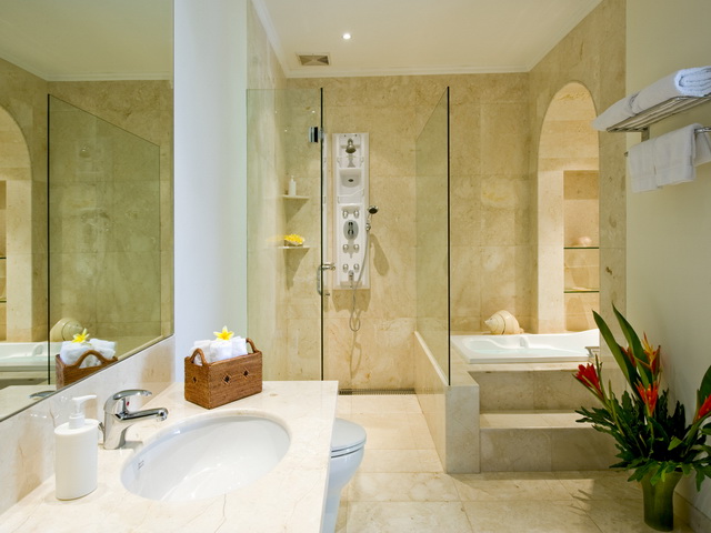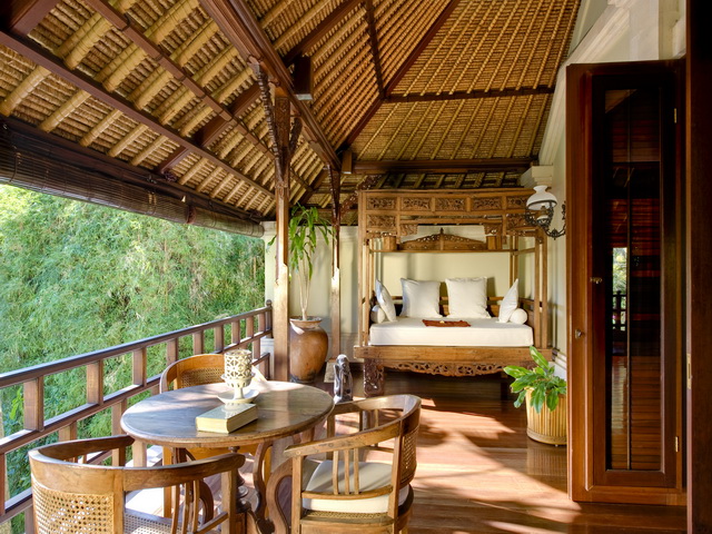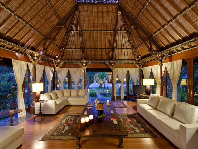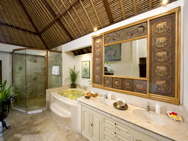 It is equipped with a TV and DVD player. The splendid ensuite bathroom is long and narrow, complete with a glass roof. At one end is a toilet and bidé behind carved Balinese doors, while at the other end an archway opens into a walk-in circular marble space with a shower. There are also twin washbasins and mirrors in carved frames.