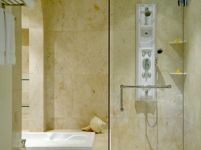 Additionally, there are two twin rooms, both with beds that can be pushed together to make a double bed. Each has an ensuite marble bathroom with a small tub, twin washbasins and a massage shower.
