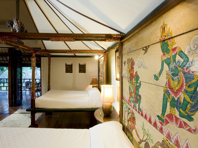 A carved griffin stands guard upon the canopy, and a scene from The Ramayana Hindu epic is depicted in coloured paintings on the headboards. There is also a walk-in closet, and a 42” TV and DVD player.