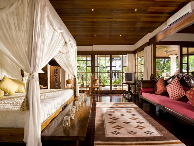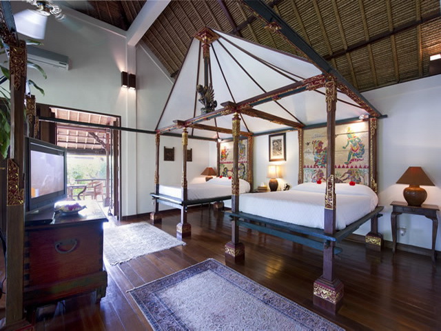 The downstairs, air-conditioned master suite features a timber floor, a king size canopied four-poster bed, a traditional Kartini sofa, and beautiful antique carved Javanese doors.