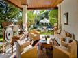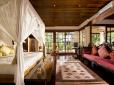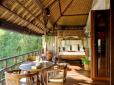 The ensuite bathroom is fitted with a large glass-walled walk-in shower, twin marble washbasins, and an ornate elephant-themed mirror from Thailand. Steps lead up into a large sunken bathtub and there is also an old apotik chest. Louvre doors from the bedroom open onto a broad wooden balcony, positioned on two sides with gorgeous views of the garden, and furnished with a carved daybed and a lazy hammock for truly chilling out.