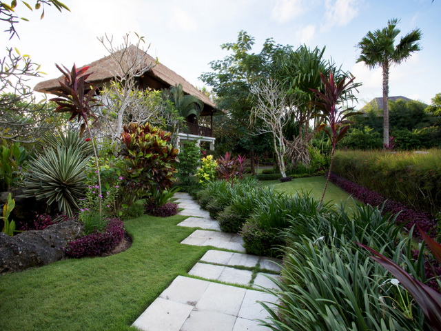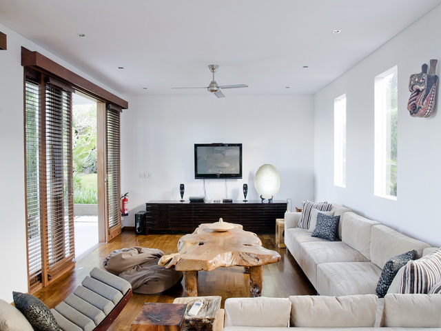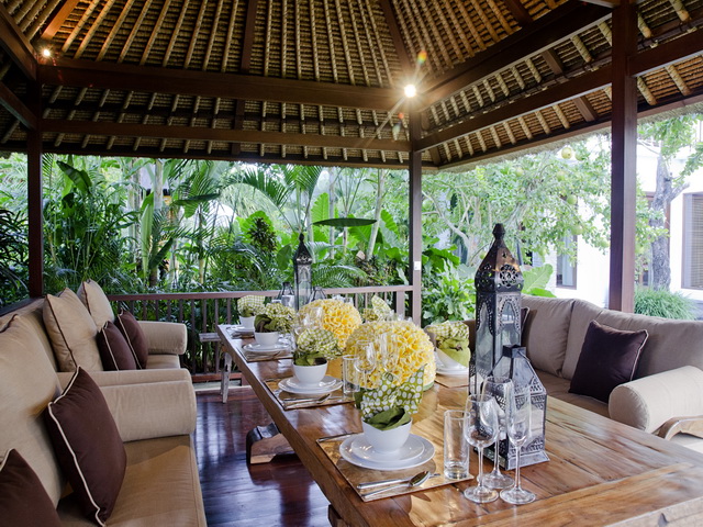 The fresh water swimming pool which is 6m x 14m is surrounded by a square dark wooden decking which is accompanied by some large wicker day loungers and umbrellas. The landscaped gardens and frangipani trees have been perfectly designed which compliment the villa. Across stepping stones to the right of the swimming pool is a separate open-air dining and living pavilion with a natural alang-alang roof. The dining table is made from solid wood with comfortable seating perfect for meals with family and friends.