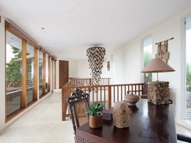 A large staircase leads to the 2nd level where a large desk is positioned and two additional bedrooms. All bedrooms in the villa are air-conditioned with private en-suite bathrooms. Upstairs there is access to a large balcony which boasts some beautiful views of Bali and the villa lawn and gardens. The balcony has natural stone stools and a glass-top table. There are various areas in the villa to relax.
