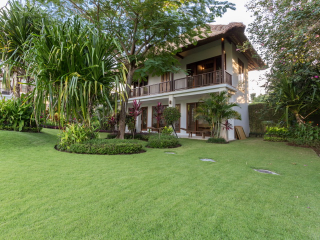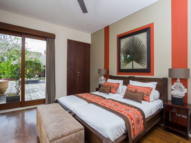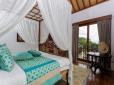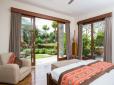 The air-conditioned master bedroom is located off the living room and features a four-poster king sized bed with mosquito net, safe deposit box, satellite television, walk in cupboard, a stunning en-suite bathroom, a beautiful natural stone bathtub, a double stone vanity and a separate shower. Access through a doorway leads you to a private garden with an over-sized terrazzo bathtub surrounded by lush tropical plantation. Relax in the tub or lay back on the hammock which is the perfect place for an afternoon rest.
