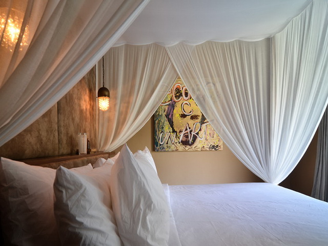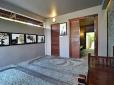A tiled pathway slices through the meticulous lawn and leads from the dining terrace (on the right side of the main building) to the second structure, housing two bedrooms. The organic materials used in the construction of this traditional structure emanate a natural ambience as does the warm golden beige toned decoration features. Both bedrooms have a huge sliding glass door as an entrance, allowing the room to be very opened up to the property or closed off and concealed by either light voilage or heavier golden beige black out curtains for absolute serenity and privacy. Each bedroom has a standing wardrobe concealed behind the bed which dominates the room in the center. You will also enjoy paintings on the wall.