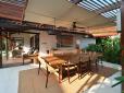 Dividing the shaded wrap-around porch of the main building into two distinct areas is the main living room, which can be opened up for natural ventilation or closed off by full-length sliding glass doors. All the walls are covered with natural colour palimanan stones, which give a wonderful outdoor feeling to this room.